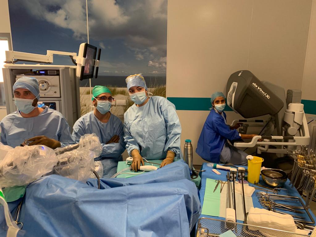 With very low tumours, approximately 1-2cm from the anorectal junction, my preference is to employ a combined transanal and robotic approach. In these cases I prefer to start with a full thickness distal rectotomy transanally, this allows for a controlled distal oncological margin under vision. Following on from this, I dock my robot and perform my TME dissection aiming to join my two planes of dissection, following which I extract my specimen transanally and perform a coloanal anastomosis.