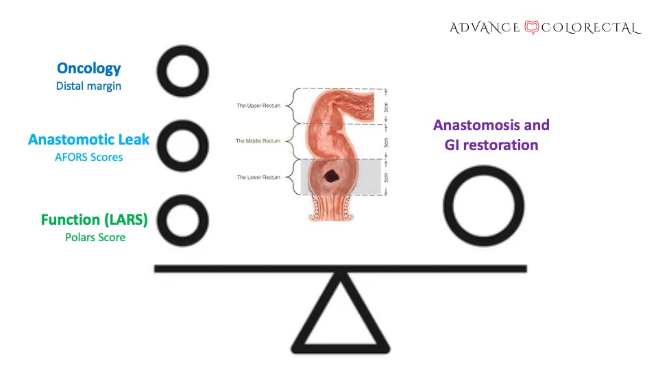 The goals of restorative surgery in low rectal cancer are three-fold, ensuring high-quality clinical outcomes by addressing and minimising the risk of anastomotic leak, ensuring optimal distal oncological clearance and proactively managing the long-term functional consequences of low anterior resection syndrome (LARS). I believe in practising the principles of evidence-based medicine and shared decision-making, discussing these key facets with my patients pre-operatively. This inevitably leads to personalised decision-making for my patients with rectal cancer, based on their values and priorities, whilst taking into account their tumour and clinical characteristics and the technical aspects of performing a coloanal anastomosis. This blog post highlights my approach to risk stratification, decision making and technical approaches to the coloanal anastomosis.